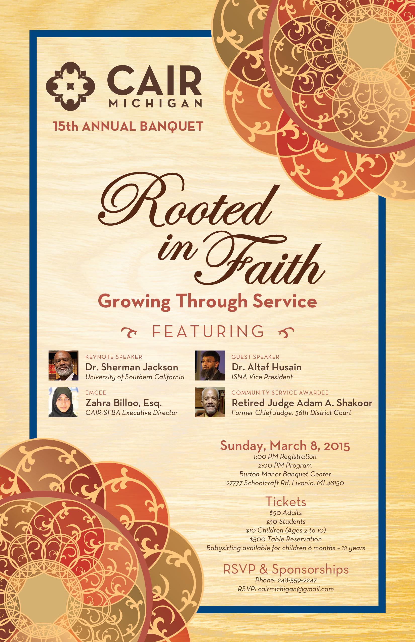 CAIR Michigan is holding the 15th Annual Banquet, “Rooted in Faith, Growing Through Service” March 8, 2015 at the Burton in Livonia, Mich. Registration and networking begins at 1 p.m.